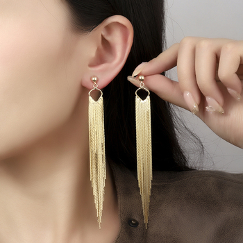 Trendy altın kaplama uzun püskül damla küpe kadınlar için büyük asılı Dangle takı gelin düğün için